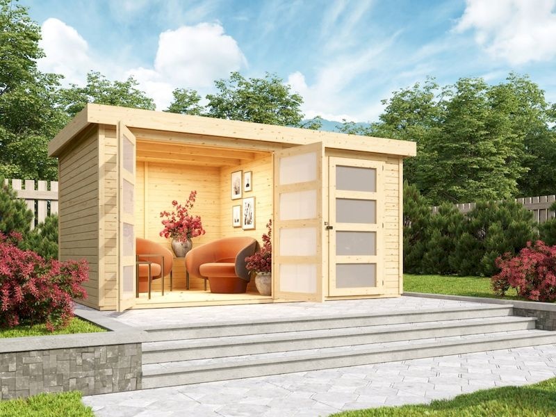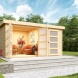 Základní model dřevěného domku pro vaši zahradu. Domek má pultovou střechu a 1× dvoukřídlé + 1× jednokřídlé dveře na pantech s oknem v každém křídle. Stavebním materiálem domku jsou profily o síle 19 mm perfektně vyfrézované ze severského smrku.