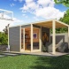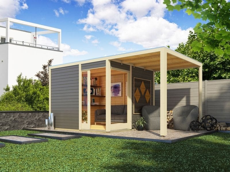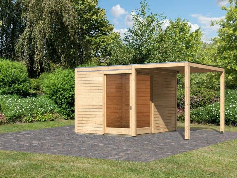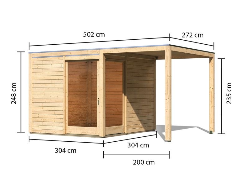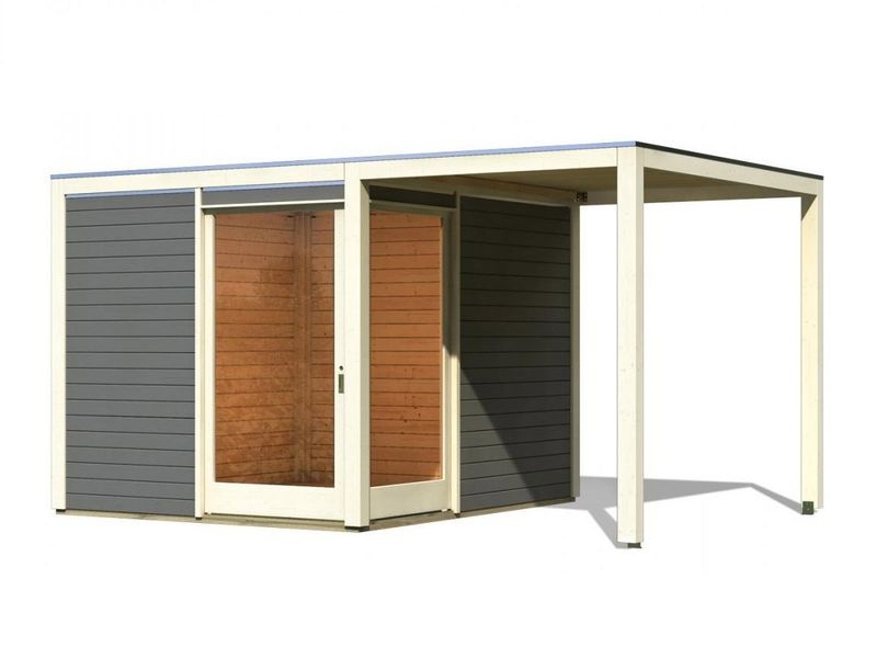 Tato verze zahradního domku obsahuje otevřený přístavek o délce 200 cm pro venkovní posezení.