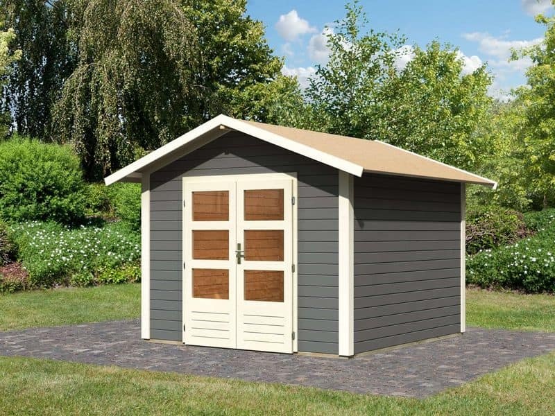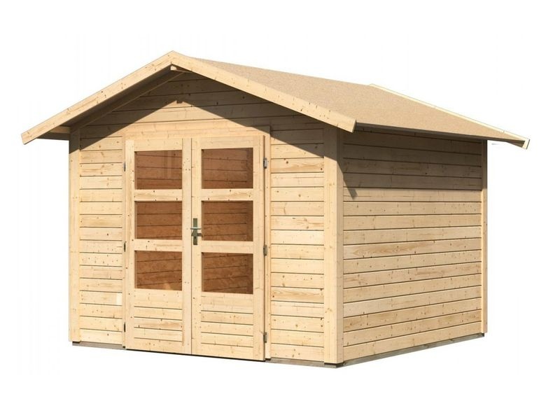 Dřevěný zahradní domek má pultovou střechu a dvoukřídlé dveře na pantech s oknem v každém křídle. Stavebním materiálem domku jsou dřevěné profily o síle 28 mm, které jsou perfektně vyfrézované ze severského smrku. Tyto modely domků jsou dostupné v přírodním provedení (natur) nebo s tmavě šedým nátěrem.