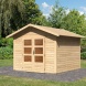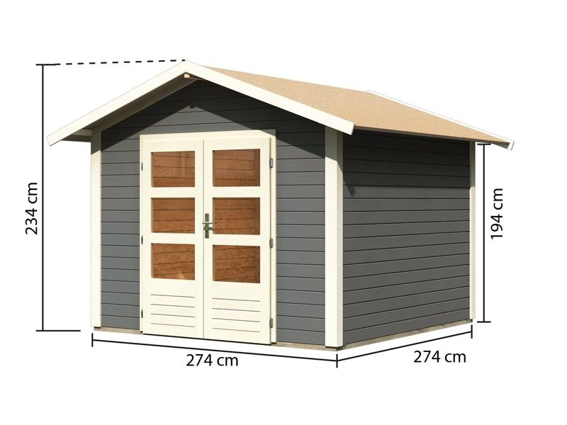 Dřevěný zahradní domek má pultovou střechu a dvoukřídlé dveře na pantech s oknem v každém křídle. Stavebním materiálem domku jsou dřevěné profily o síle 28 mm, které jsou perfektně vyfrézované ze severského smrku. Tyto modely domků jsou dostupné v přírodním provedení (natur) nebo s tmavě šedým nátěrem.