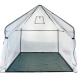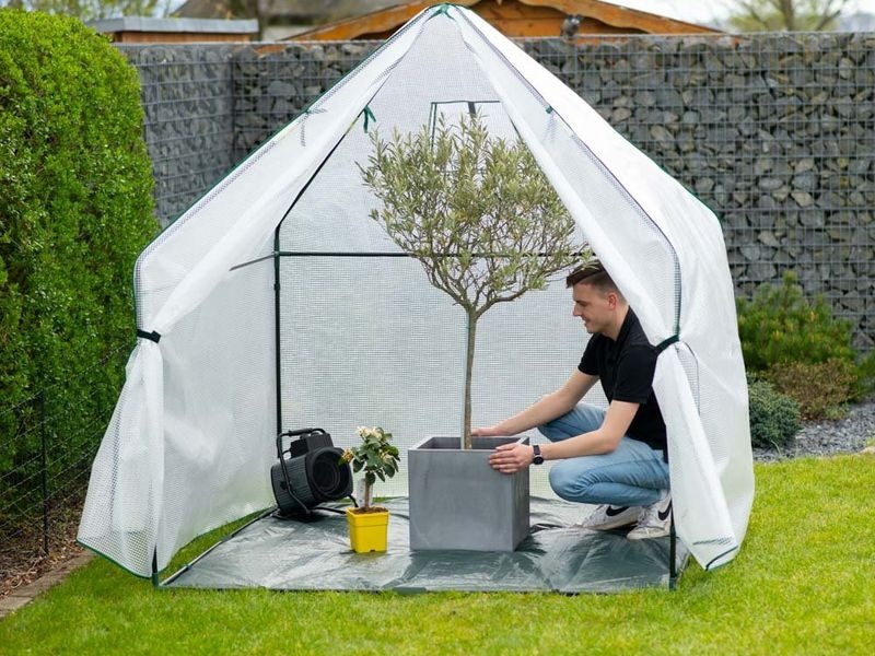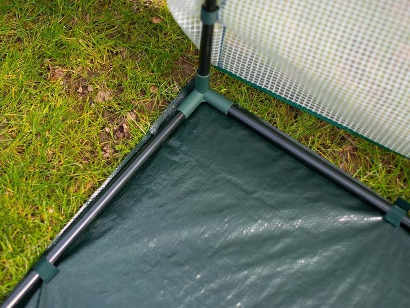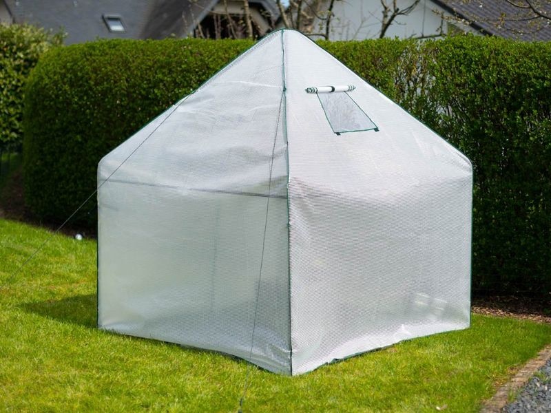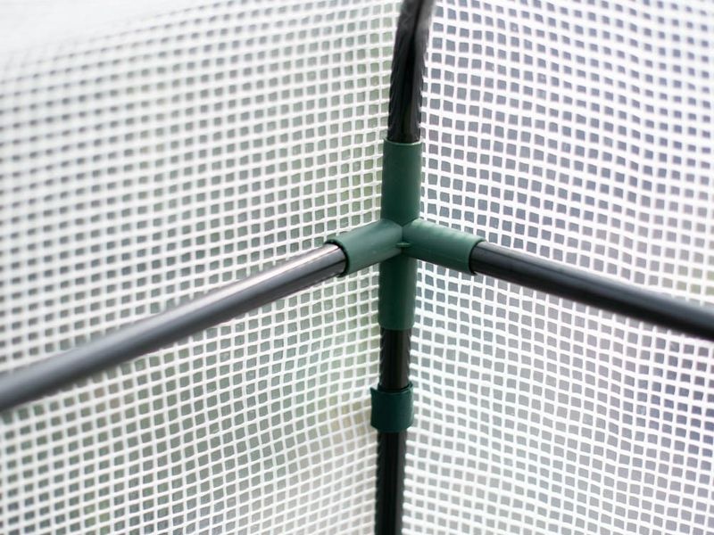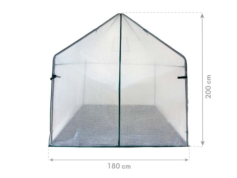 Stabilní ocelová konstrukce je potažena odolnou UV-stabilní fólií, která v létě chrání před intenzivním sluncem a v zimě zajišťuje izolační efekt proti chladu. Součástí je také větrací okno, které usnadňuje regulaci teploty a vlhkosti uvnitř. Vstup je řešen praktickými dveřmi na zip, jež lze pohodlně otevřít a zajistit.