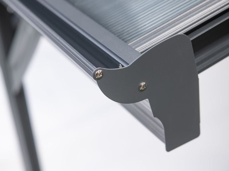Pevný rám z práškově lakovaného hliníku v barvě antracit (RAL 7016) je odolný proti korozi a nevyžaduje žádnou speciální údržbu. Přístřešek je koncipován pro celoroční venkovní použití.