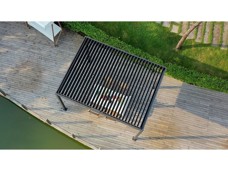 Střešní lamely lze elektricky naklápět v rozmezí 0° až 120°, což vám umožňuje snadno regulovat množství slunečního světla pronikajícího do pergoly. Dálkové ovládání umožňuje pohodlnou změnu polohy lamel – při zavřených lamelách pergola poskytuje plnou ochranu před deštěm a při otevřených lamelách zase maximální ventilaci. LED osvětlení, které je integrováno po vnitřních stranách pergoly, je rovněž ovládané dálkovým ovladačem.
