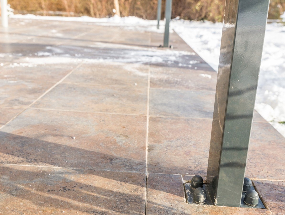 Pokud umístíte sloupky pergoly na okraj terasy, připevněte krytky šroubů silikonem na plasty.