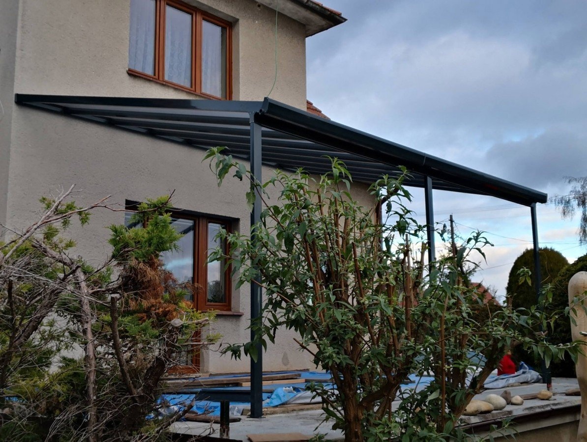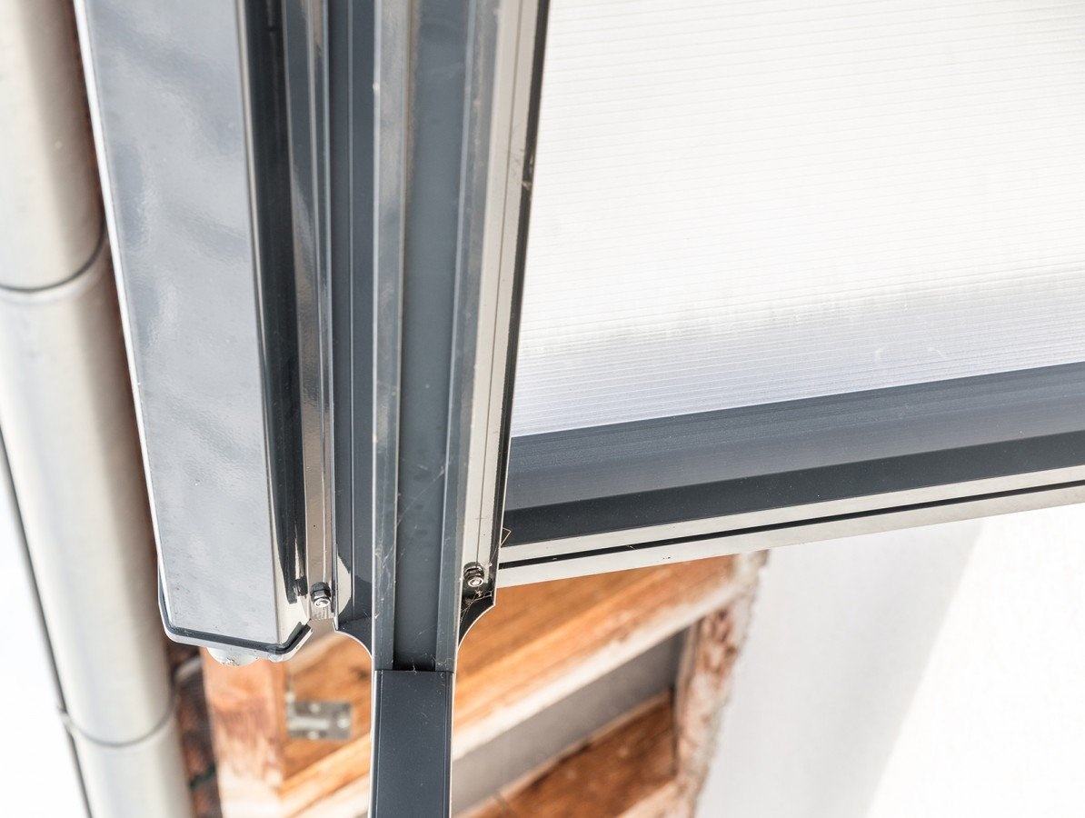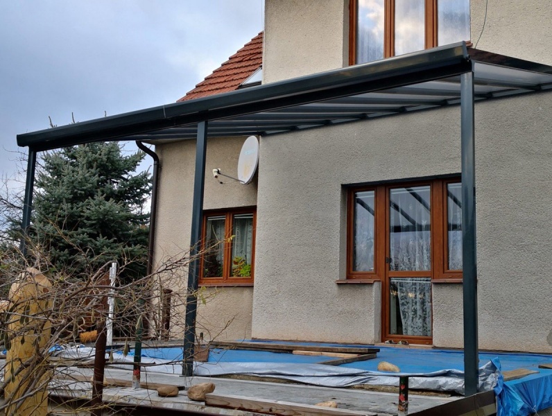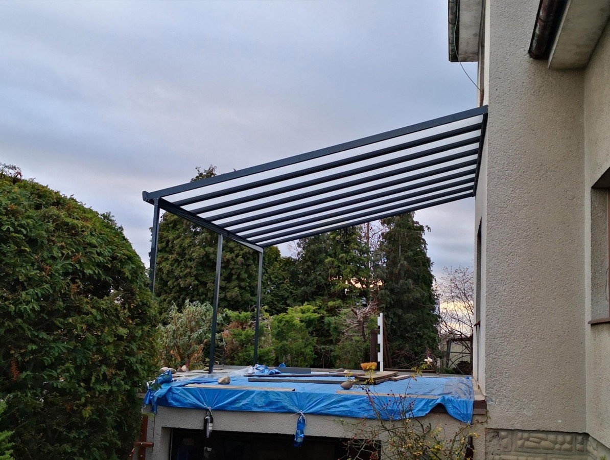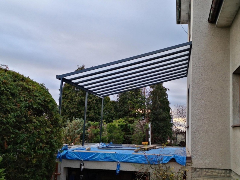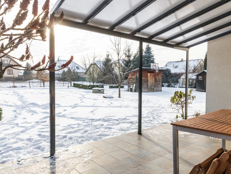 Elegantní pergola Terrassendach Original v široké škále rozměrů s nastavitelným sklonem. Pergola je vyrobena z robustních hliníkových profilů. Zastřešení je řešeno komůrkovým polykarbonátem tloušťky 10 mm se zámky. Země výroby: Německo.