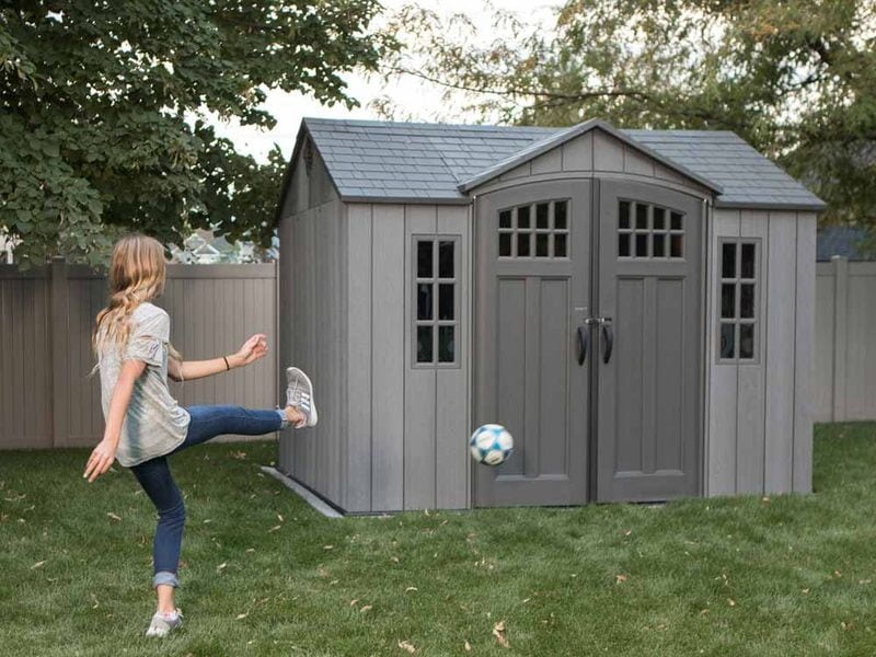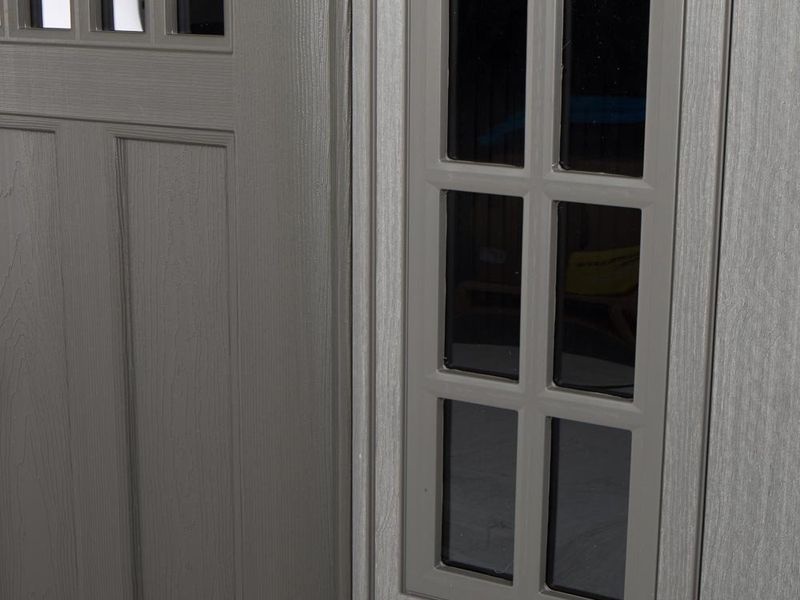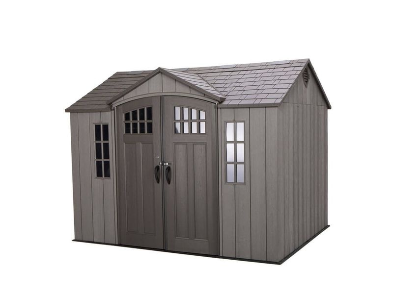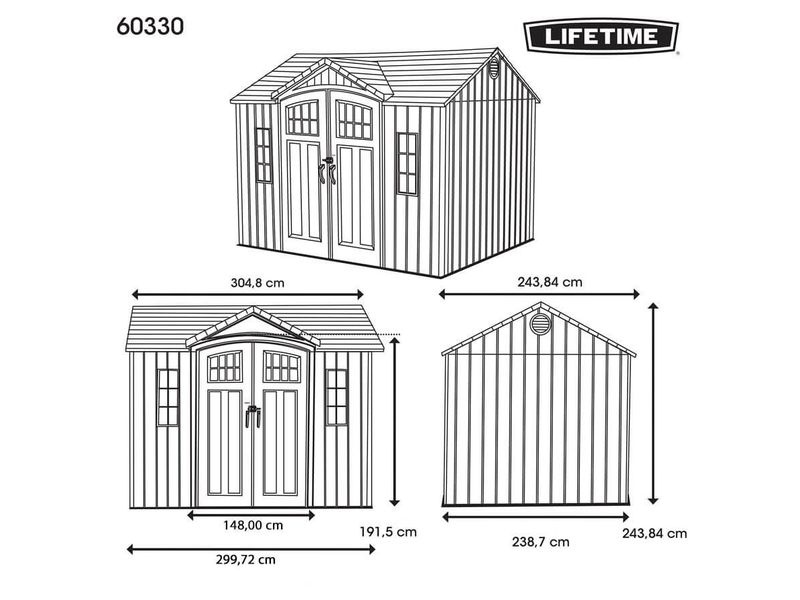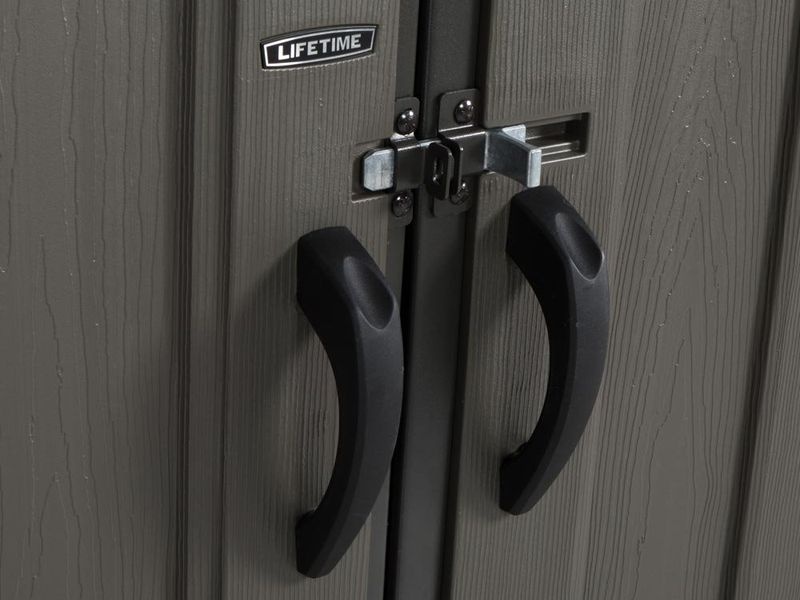 Součástí domku jsou také velké dvoukřídlé dveře, které umožňují snadný přístup a jednoduché uložení vašeho vybavení. Můžete tak v domku bez problému uschovat i širší zahradní náčinní.