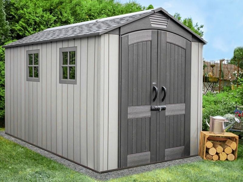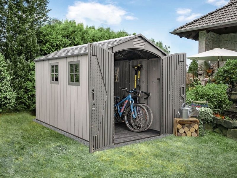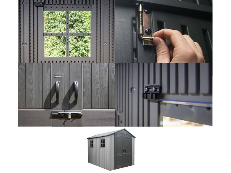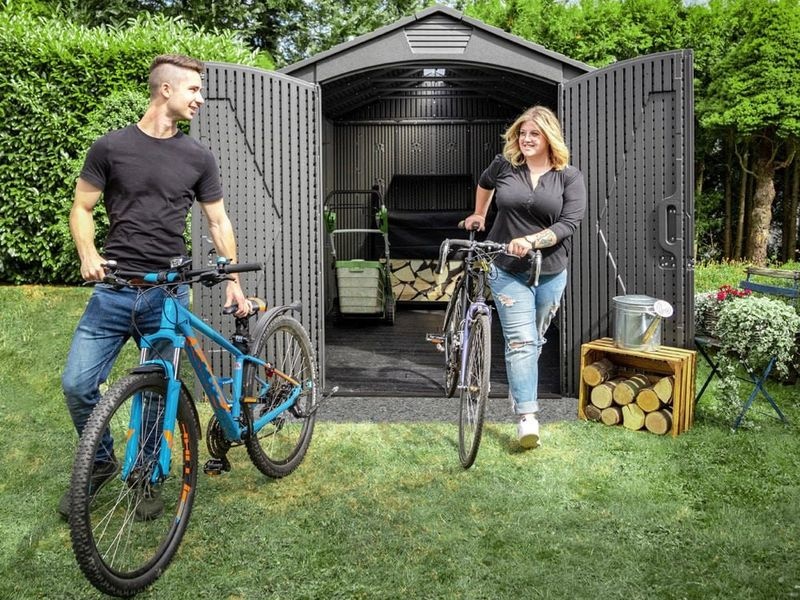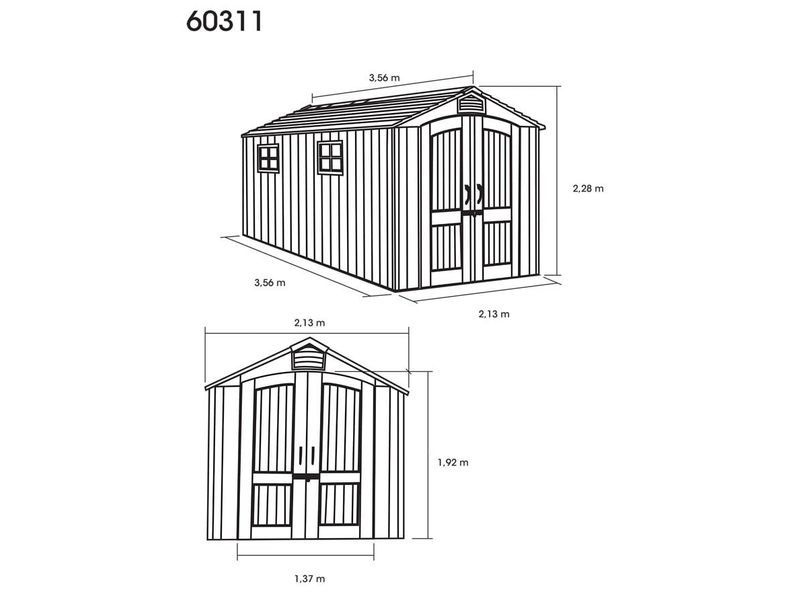 Součástí domku jsou také velké dvoukřídlé dveře, které umožňují snadný přístup a jednoduché uložení vašeho vybavení. Můžete tak v domku bez problému uschovat i širší zahradní náčinní.