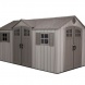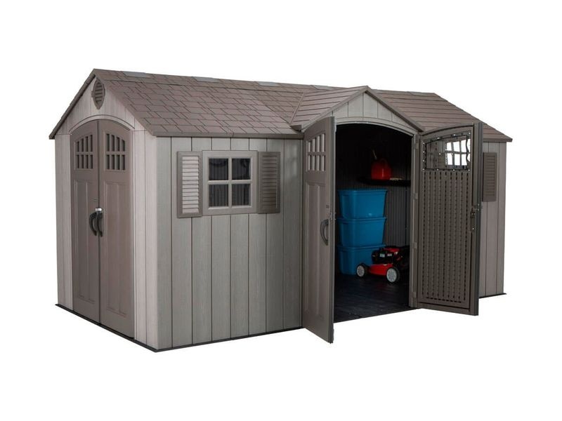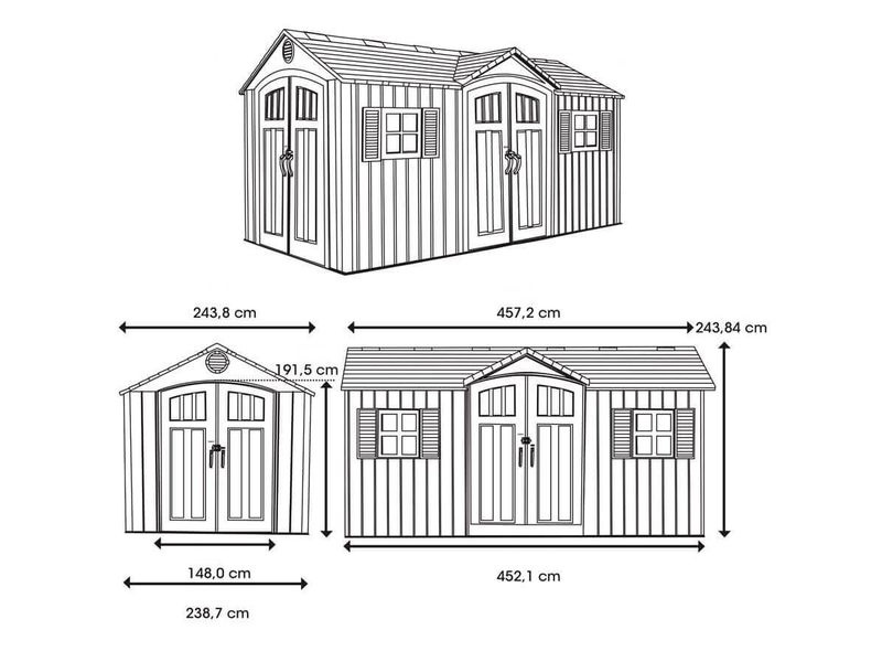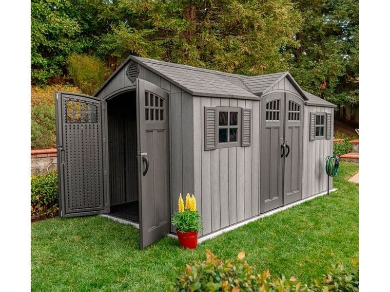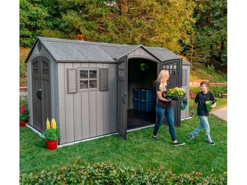 Zahradní domek je dále vybaven dvěma dvojitými dveřmi na pantech s prosklením, které zajišťují větší komfort při ukládání náčiní a jiného vybavení do plastového domku. Díky hrubému povrchu stěn v tmavě šedé barvě („Rough-Cut“ s mimikou dřeva) je kůlna nejen praktickým přístřeškem pro vaše nářadí a zahradní potřeby, ale také skutečnou ozdobou vaší zahrady.