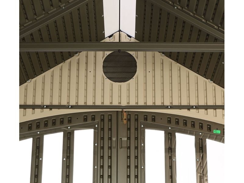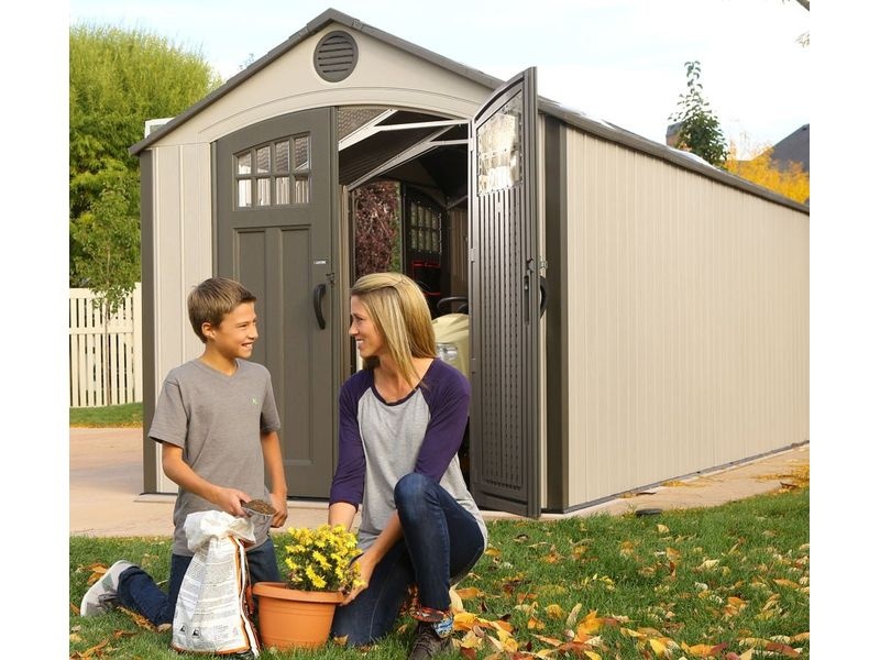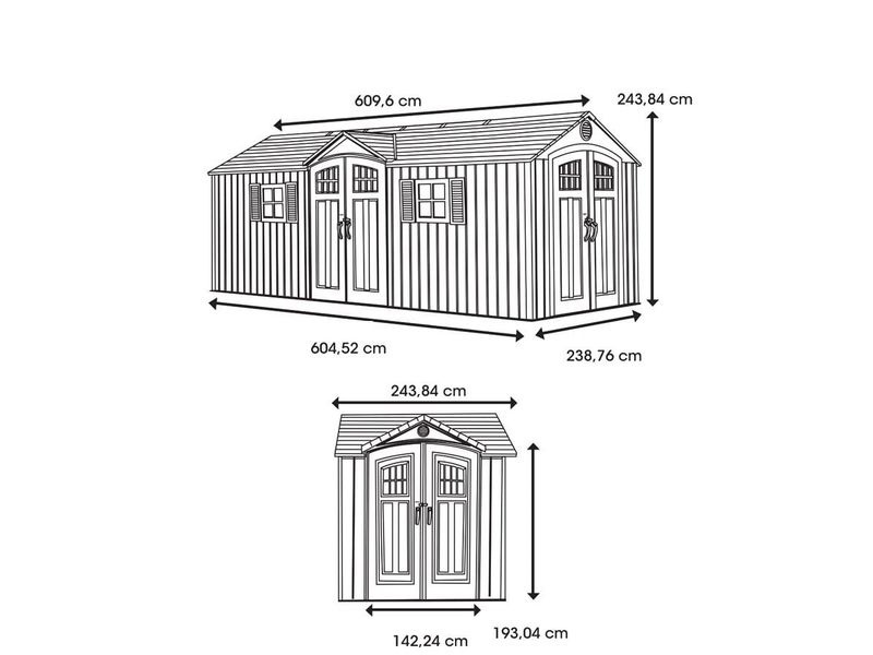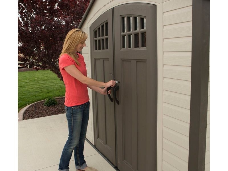 Zahradní domek je dále vybaven dvěma dvojitými dveřmi na pantech s prosklením, které zajišťují větší komfort při ukládání náčiní a jiného vybavení do plastového domku. Díky hladkému, světle šedému povrchu stěn kůlna přirozeně a nenápadně zapadne do téměř každé zahrady.