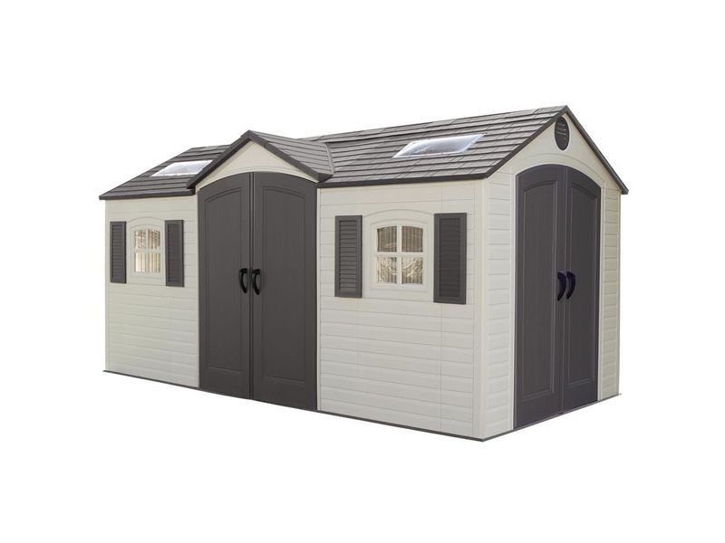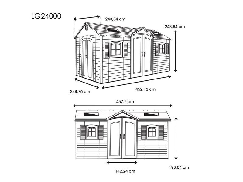 Součástí domku jsou také velké dvoukřídlé dveře, které umožňují snadný přístup a jednoduché uložení vašeho vybavení. Můžete tak v domku bez problému uschovat i širší zahradní náčinní.