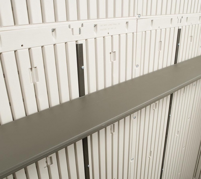 Součástí domku je police (228 × 23 cm), na které můžete uschovat například kufr s nářadím. Dále také čtyři rohové police, které poskytnou dostatečný úložný prostor.
