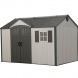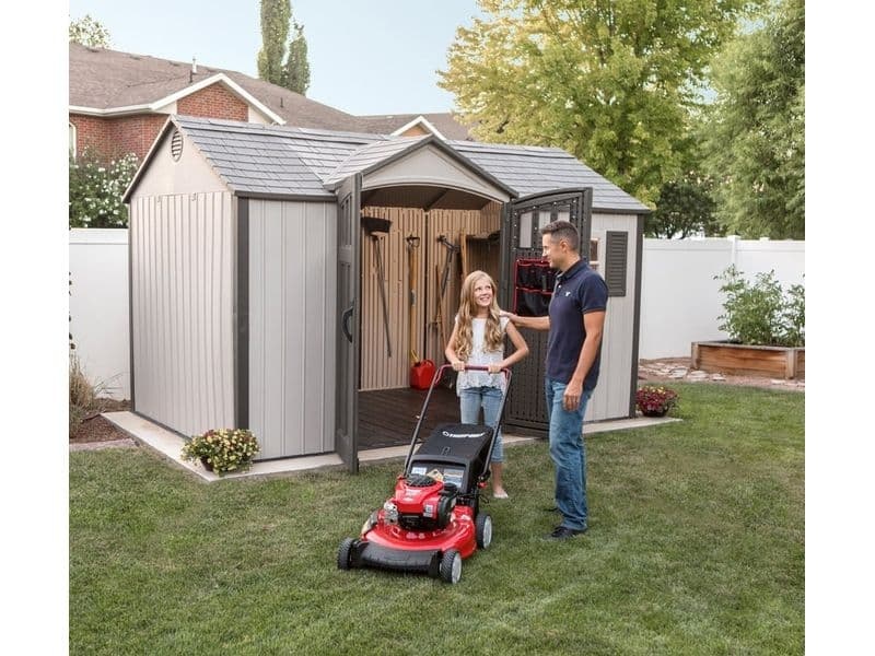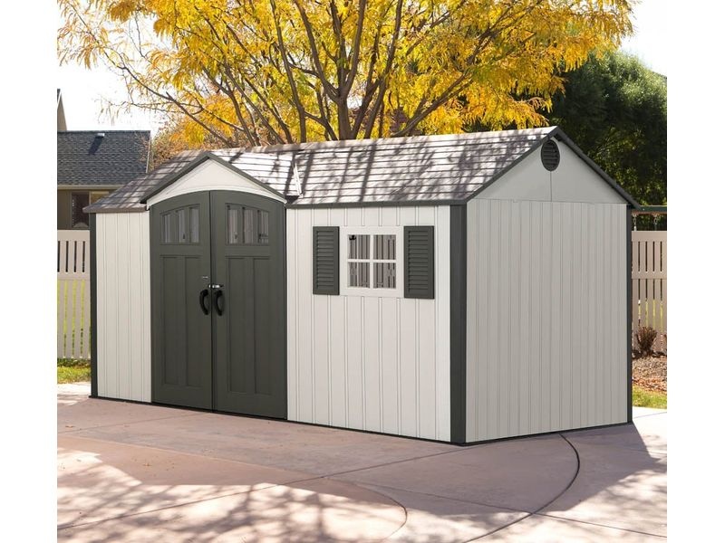 Zahradní domek je dále vybaven dvojitými dveřmi na pantech s prosklením, které zajišťují větší komfort při ukládání náčiní a jiného vybavení do plastového domku. Díky hladkému, světle šedému povrchu stěn kůlna přirozeně a nenápadně zapadne do téměř každé zahrady.