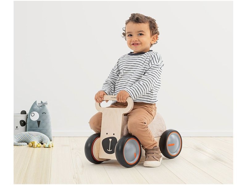 Chodítko je vyrobeno z udržitelné břízy, což zajišťuje odolnost a šetrnost k životnímu prostředí. Materiál neobsahuje žádné chemikálie, a tak je bezpečný pro vaše dítě. Měkké a zaoblené hrany poskytují dodatečnou bezpečnost při prvních jízdních pokusech a učení chůze. Měkké plyšové sedadlo je odnímatelné a umožňuje snadný přístup k úložnému prostoru, čímž se z chodítka stane mini vozík pro děti.