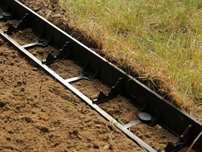 Skrytý obrubník můžete tvarovat do oblouků nebo stočit okolo kořenů stromů. Instaluje se pod rovinu terénu, tak aby bylo vidět cca 5 mm z jeho vrchní stěny. Pokud oddělujete dlažbu od trávníku, zvolte alespoň takovou výšku obrubníku, jaká je výška dlažby.