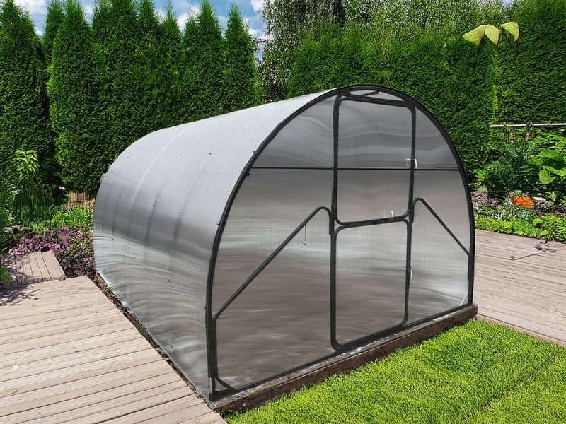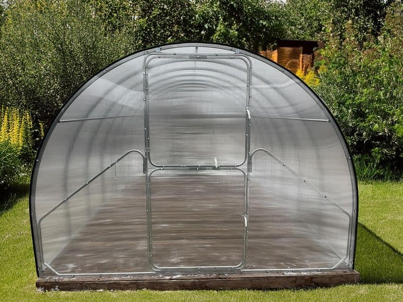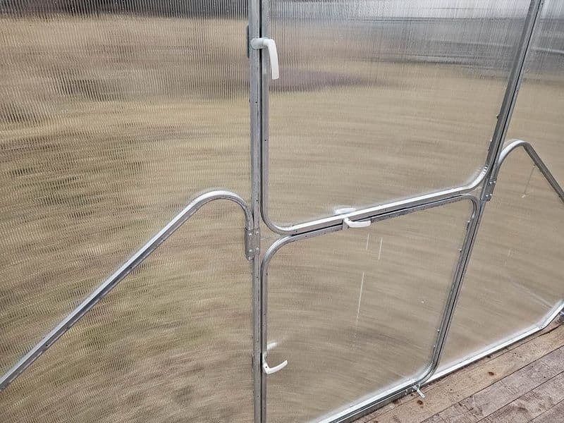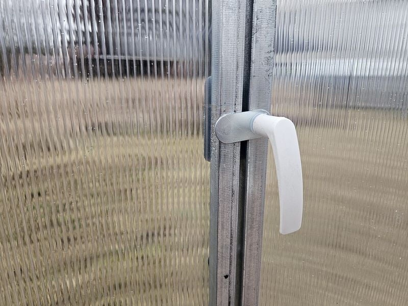 Skleník je průchozí – má dvoje jednokřídlé dveře (90×197 cm), kde lze horní díl použít jako okno pro lepší ventilaci.