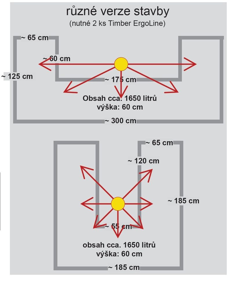 Každé patro vysokého záhonu je složeno ze 12-ti „kamenů“. Je možné seskládat 2× JUWEL TIMBER ERGOLINE do různých sestav. Vysoký záhon nemá pevné dno.