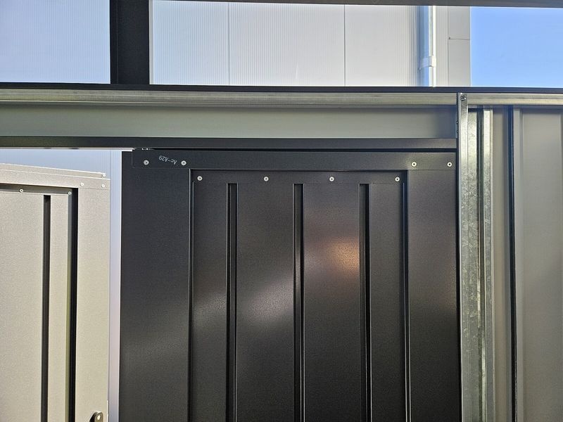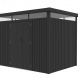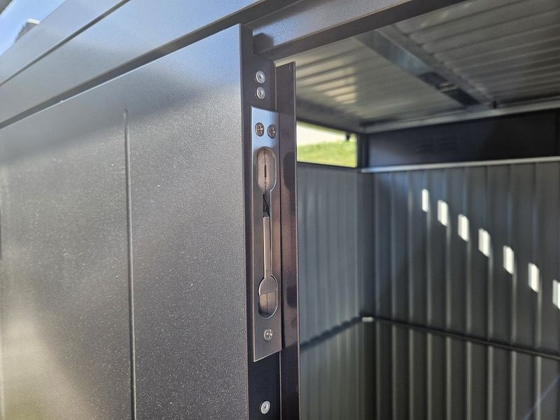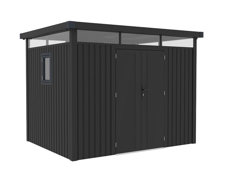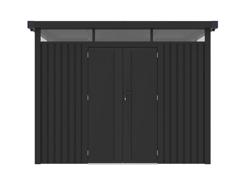 Tato praktická konstrukce váží 199 kg a má antracitovou barvu, která se snadno začlení do každého venkovního prostředí. Plochá střecha a dvojité křídlové dveře dodávají domku jednoduchý a moderní vzhled.