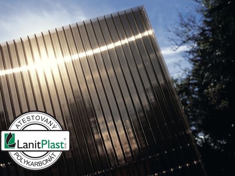 Bronzová, čtyřstěnná polykarbonátová deska Marlon FRW o síle 10 mm od renomovaného britského výrobce BRETT MARTIN Ltd. Jedná se o jeden z nejkvalitnějších polykarbonátů na evropském trhu.