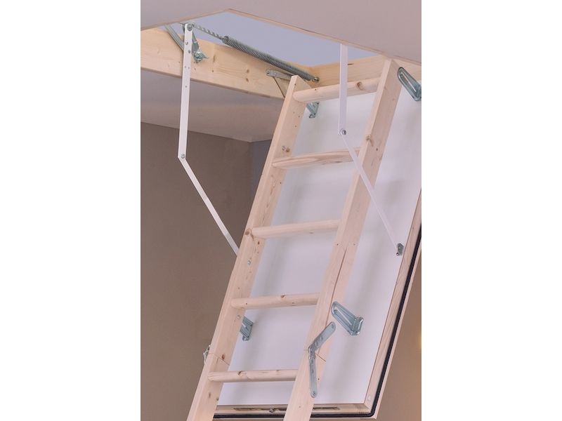 Na víku je namontován složený třídílný žebřík s gumovými patkami a madlo. Půdní schody jsou opatřeny párem ocelových pružin, které brzdí pád při otevírání a napomáhají při zavírání.