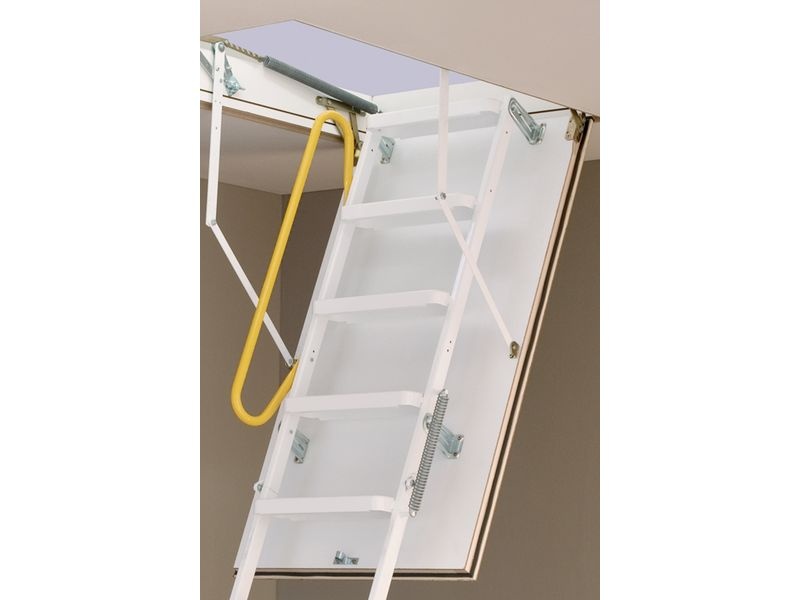 Na tomto víku je namontován složený třídílný, práškově lakovaný ocelový žebřík opatřený gumovými stopkami. Půdní schody jsou opatřeny párem ocelových pružin, které brzdí pád při otevírání a napomáhají při zavírání. součástí vybavení je boční madlo.