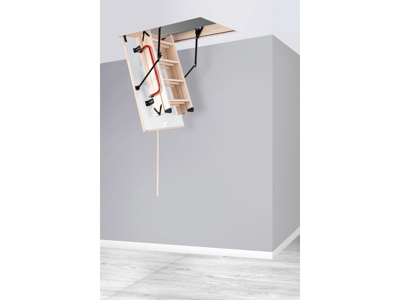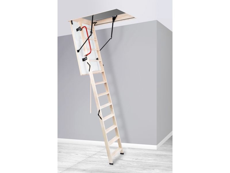 Skládací půdní schody jsou složeny ze čtyř dílů dřevěného výlezového žebříku. Jednotlivé díly jsou navzájem spojeny speciální ocelovou sponou, která zajišťuje pevný spoj. Dřevěné nášlapy mají protiskluzovou úpravu a s pomocným madlem zajišťují bezpečnější pohyb po schodech.