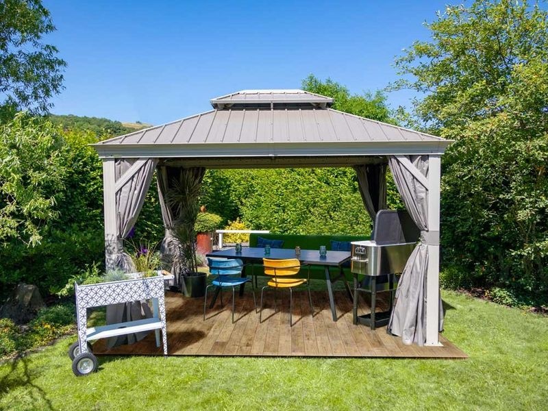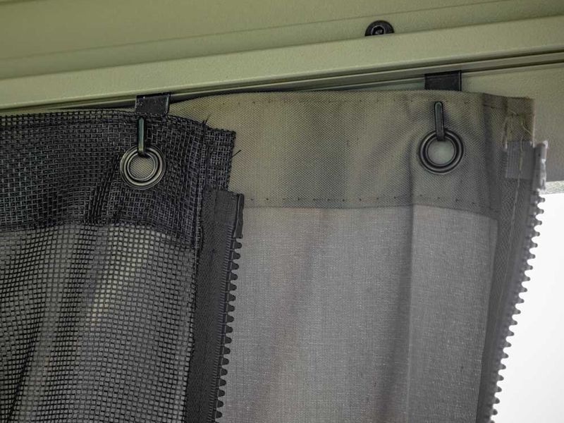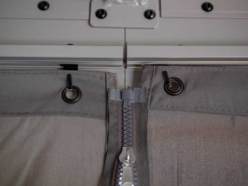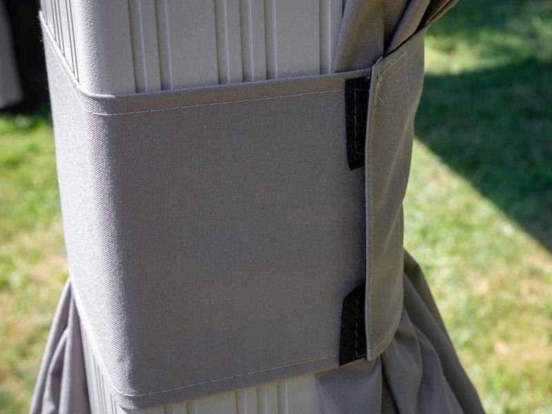 V zavřeném stavu jsou závěsy připevněny pouze pomocí klipů. Vchod na zip je na každé straně altánu. Součástí dodávky jsou záclony a připevňovací klipy.