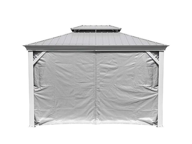 Sada závěsů je určena pro celý altán. Pokrývá všechny strany, přičemž závěsy jsou připevněny na jinou kolejnici než sítě proti hmyzu pomocí dvojitého kolejnicového systému. Tím zajišťují jednudušší manupulaci.