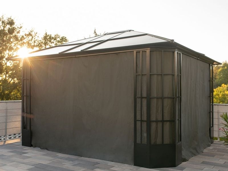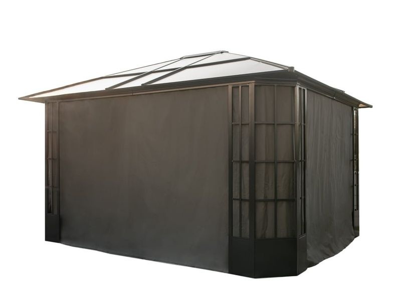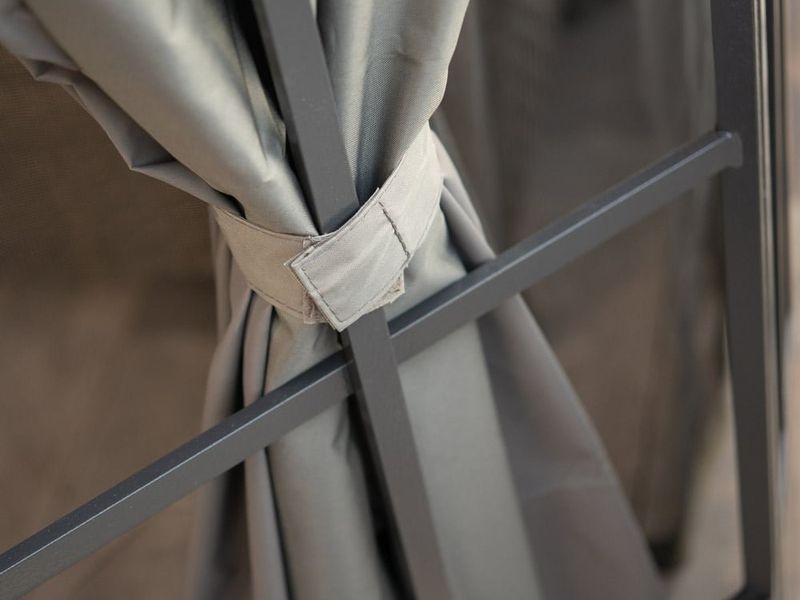 Sada závěsů k altánu Savino 1214, které vám v létě poskytnou stín i soukromí. Barva: tmavě šedá