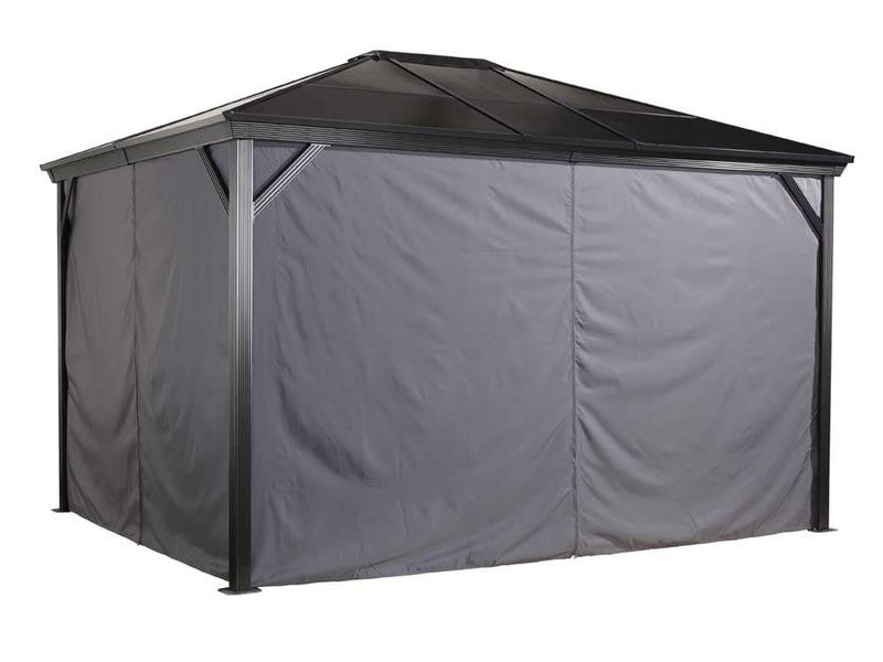 Sada závěsů je určena pro celý altán. Pokrývá všechny strany, přičemž závěsy jsou připevněny na jinou kolejnici než sítě proti hmyzu pomocí dvojitého kolejnicového systému. Tím zajišťují jednudušší manupulaci.