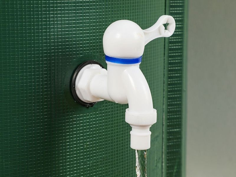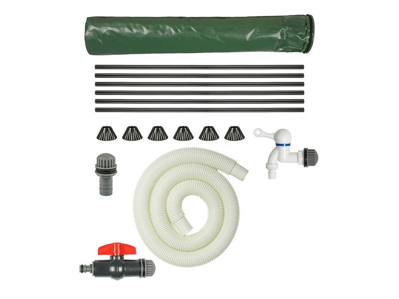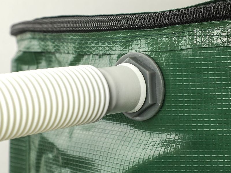 Sud je vyroben z pevného PVC a podepřen stabilním rámem z 8 PVC tyčí (Ø 20 mm). Víko je opatřeno zipem a integrovanou mřížkou proti nečistotám. Dva praktické výpustné ventily umožňují připojení hadice nebo pohodlné plnění konve. Sud je vybaven i přepadem, který zabraňuje přeplnění. Díky jednoduchému montážnímu systému zvládnete stavbu během krátké chvíle bez použití speciálního nářadí.