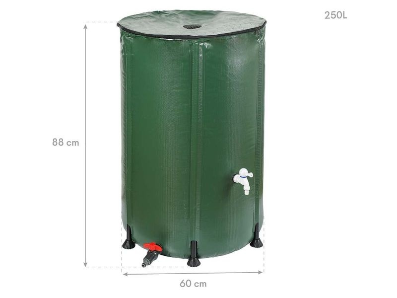 Konstrukci tvoří stabilní PVC rám a UV-odolný plášť, který spolehlivě odolává povětrnostním vlivům. Sud je vybaven víkem na zip s ochrannou mřížkou proti nečistotám a dvěma odtokovými ventily – pro napojení zahradní hadice i snadné napouštění konve. Díky promyšlenému systému je montáž rychlá a nevyžaduje speciální nářadí.