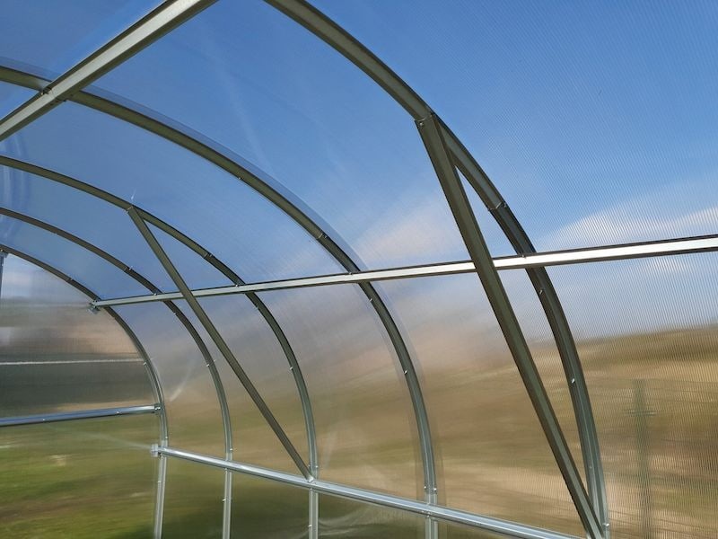 Konstrukce skleníku je sestavena ze silných nosných oblouků – žárově pozinkované ocelové profily o síle 1 mm a šířce 56 mm (výrobce oceli: United States Steel). Součástí je rovněž prémiový komůrkový polykarbonát s UV filtrem od britské firmy BRETT MARTIN.