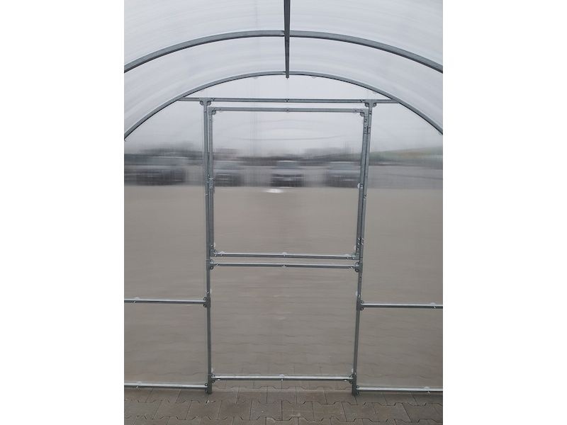 | zahradní skleník TIBERUS | pozinkovaný ocelový profil 1 mm, rozteč oblouků 100 cm, dvojité dveře vpředu, ventilační okno vzadu, prosklení nutno vyřezat z dodaných polykarbonátových desek, možnost montáže střešního okna – ano |