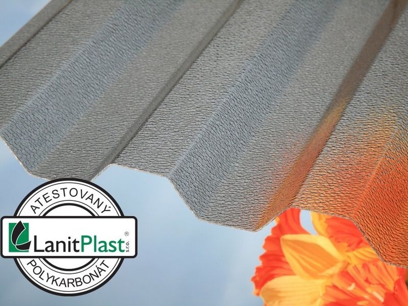 Trapézová polykarbonátová deska s povrchovou krupičkou na vnitřní straně (určenou pro rozptyl světla). Profil 76/16. Povrchová krupička láme světlo, takže desky nejsou úplně průhledné, ale průsvitné. Vzniká pod nimi příjemný jemný chládek při zachování světelné propustnosti.