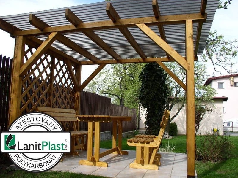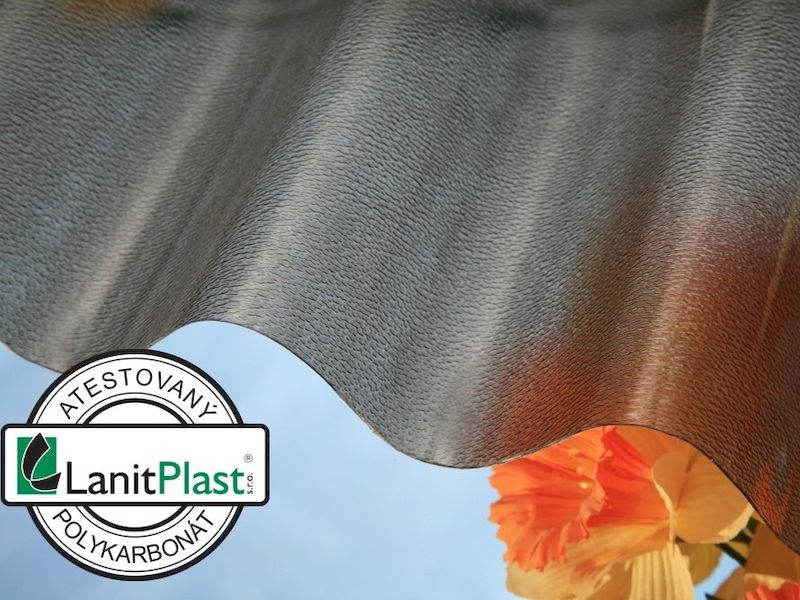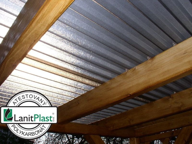 Vlnité desky z polykarbonátu o síle 0,8 mm s s povrchovou krupičkou na vnitřní straně určenou pro rozptyl světla. Povrchová krupička láme světlo, takže desky nejsou úplně průhledné, ale průsvitné a vzniká pod nimi příjemný jemný chládek při zachování světelné propustnosti.