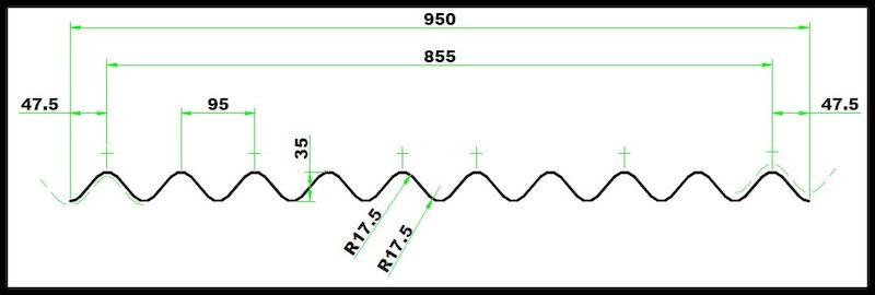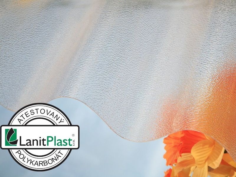 Vlnité desky z polykarbonátu o síle 0,8 mm s povrchovou krupičkou na vnitřní straně určenou pro rozptyl světla. Povrchová krupička láme světlo, takže desky nejsou úplně průhledné, ale průsvitné a vzniká pod nimi příjemný jemný chládek při zachování světelné propustnosti.