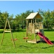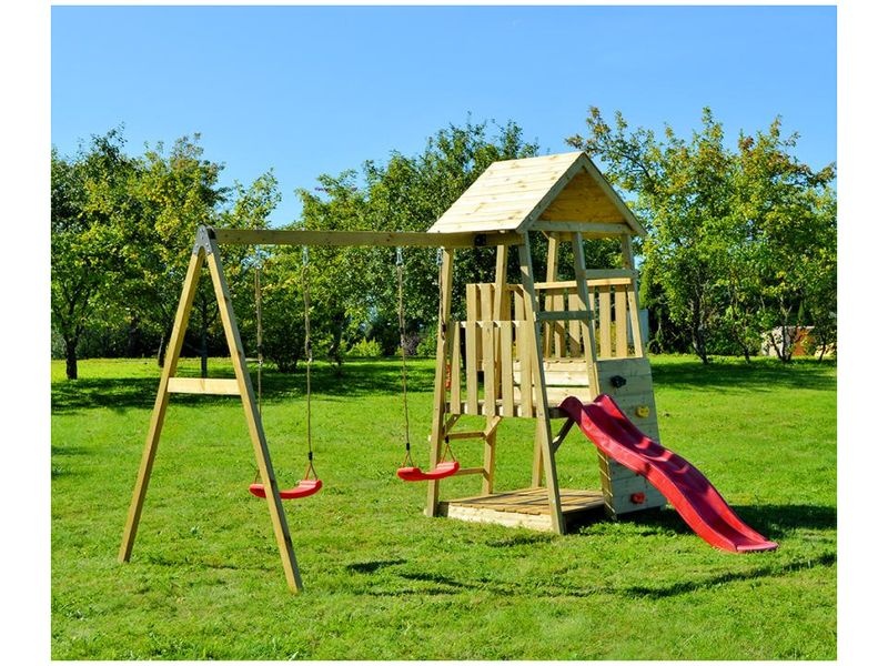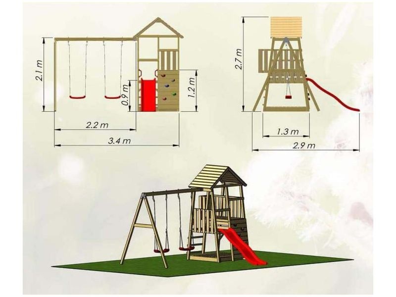 Hrací věž s rozměry 290×340×270 cm je praktickým a zábavným doplňkem do vaší zahrady. Součástí věže je skluzavka s houpačkami a lezeckou stěnou, což dětem poskytne skvělé možnosti pro hraní. Je ideálním místem pro dobrodružství a kreativní hru, která vaše děti potěší a zabaví.