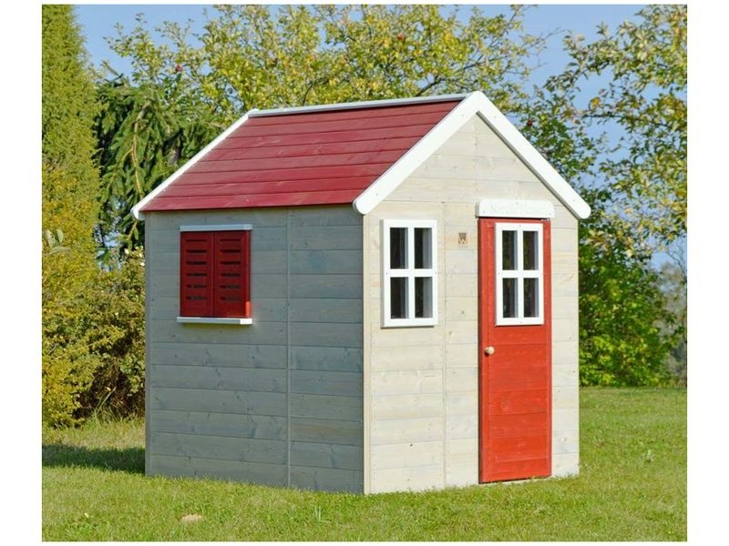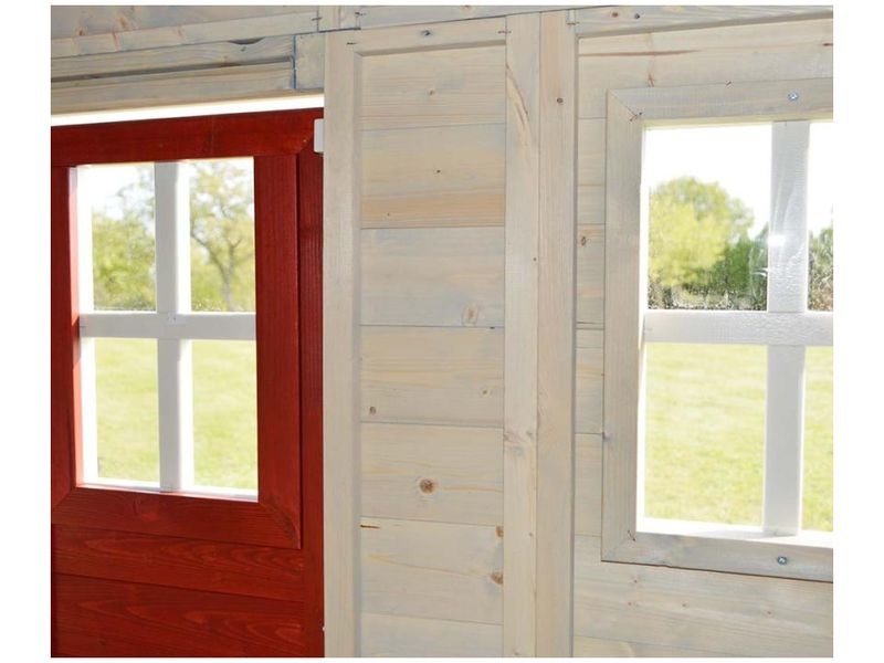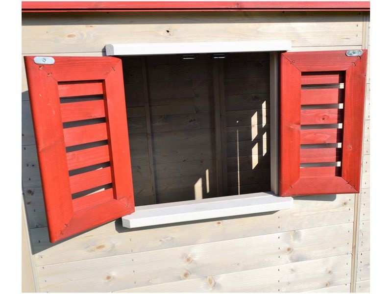 Domeček na hraní zaujme svým přirozeným vzhledem z borovicového dřeva. Jedno mřížové okno z plexiskla a druhé okno s okenicemi dodávají domečku jedinečný a přitažlivý vzhled, který děti okouzlí.
