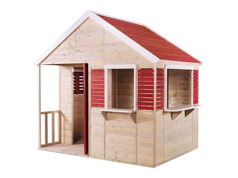 Domeček na hraní zaujme svým přirozeným vzhledem z borovicového dřeva. Jedno okno s květinovým boxem a druhé okno s pruhovanou markýzou dodávají domečku jedinečný a přitažlivý vzhled, který děti okouzlí.