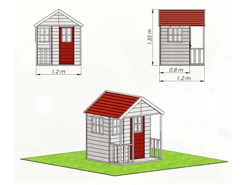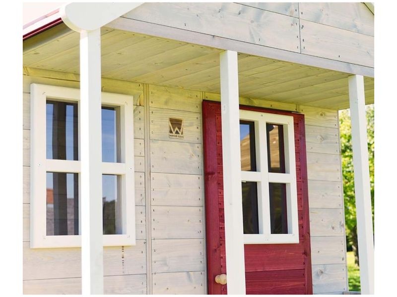 Domeček na hraní zaujme svým přirozeným vzhledem z borovicového dřeva. Dvě mřížová okna s plexiskly a krytá veranda následována červenými vstupními dveřmi dodávají domečku jedinečný a přitažlivý vzhled, který děti okouzlí.