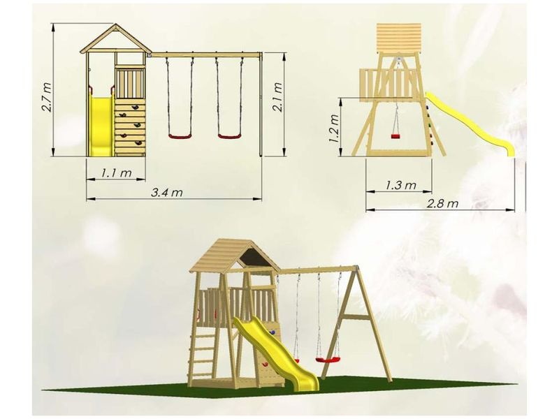 Hrací věž rozměry 280×340×270 cm je praktickým a zábavným doplňkem do vaší zahrady. Součástí věže je skluzavka s houpačkami, lezeckou stěnou a pískovištěm, což dětem poskytne skvělé možnosti pro hraní. Je ideálním místem pro dobrodružství a kreativní hru, která vaše děti potěší a zabaví.