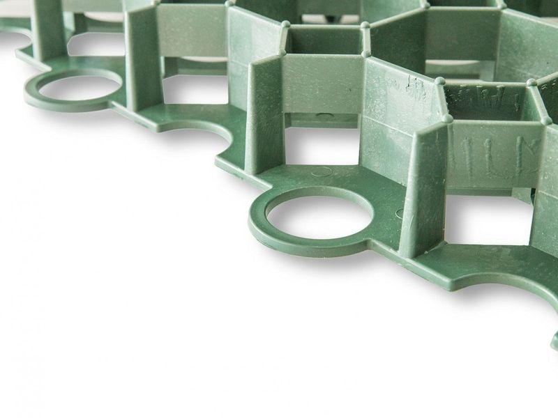 Vegetační dlažba je vyrobena z vysokohutnostního polyetylenu (HDPE), který odolává UV záření, větru i dešti. Nepoškodí je ani nafta, benzín nebo silniční soli. Plastová dlažba je 100% recyklovatelná a šetrná k životnímu prostředí.